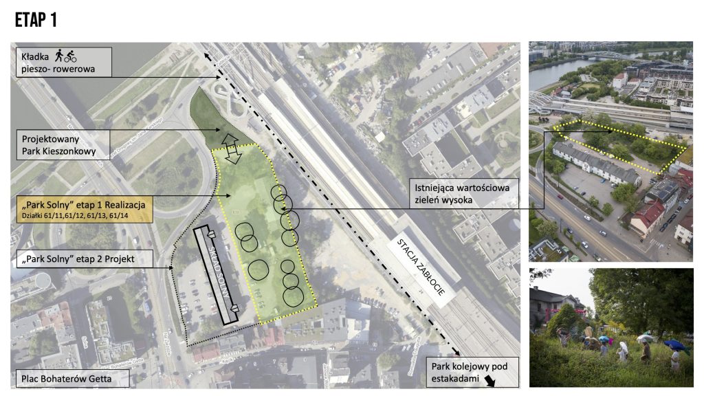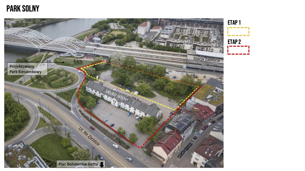 Etap I zakłada opracowanie projektu dla całego obszaru parku oraz podstawowe zagospodarowanie zieleni na terenie między budynkiem Składu Solnego, a stacją kolejową Kraków Zabłocie.